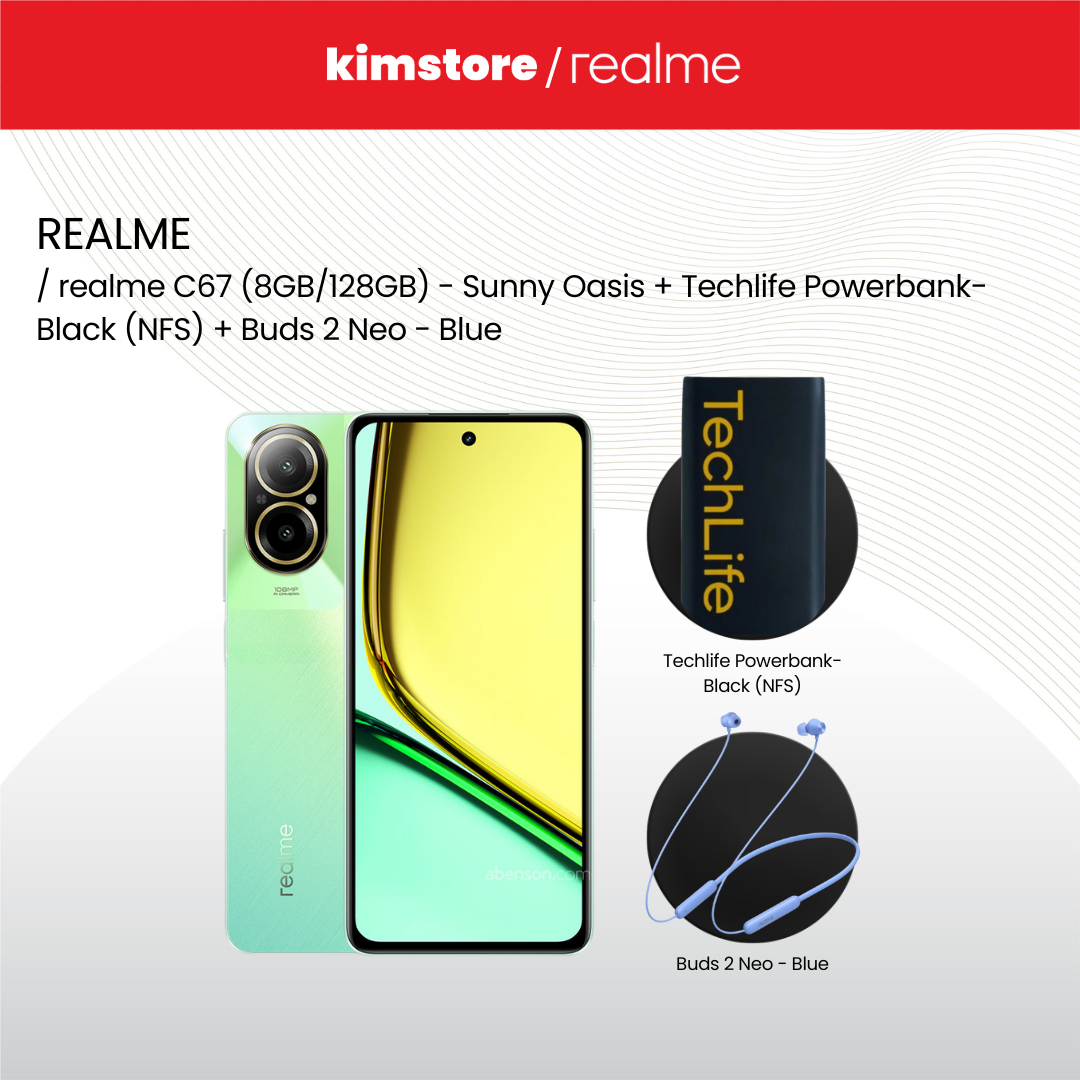 1. REALME C67 (8GB/128GB) - Sunny Oasis + REALME Techlife Powerbank- Black (NFS) + REALME Buds 2 Neo - Blue