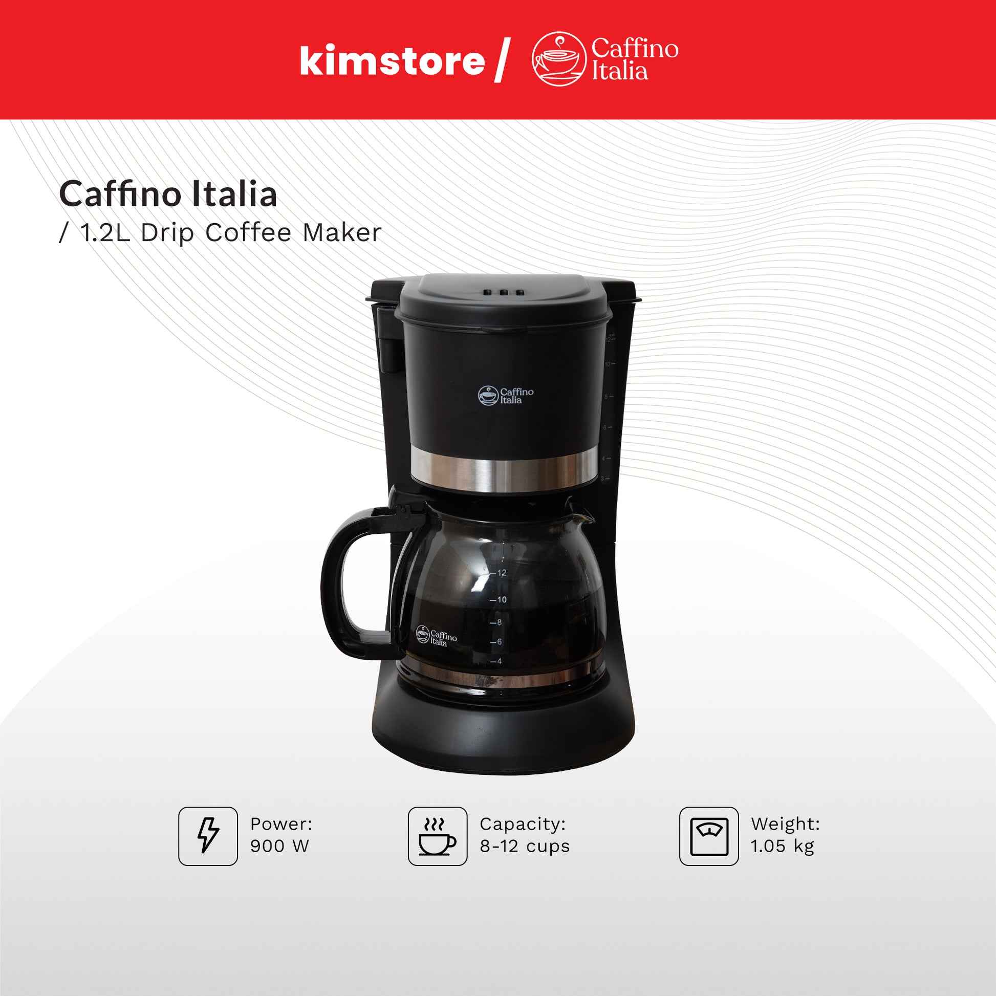 The Caffino Italia Drip Coffee Maker has 8-12 Cups (1.2L) of capacity so everyone can wake up, stay up, and enjoy a mug of coffee.