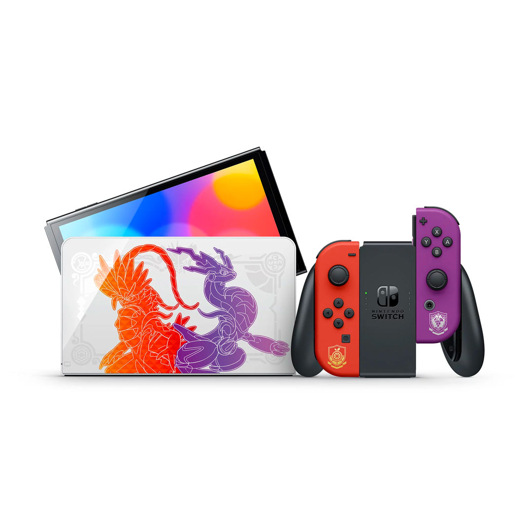 The Nintendo Switch – OLED Model: Pokémon Scarlet & Violet Edition system features special illustrations of the Legendary Pokémon appearing in the Pokémon Scarlet and Pokémon Violet games, Koraidon and Miraidon, as well as the partner Pokémon Sprigatito, Fuecoco, and Quaxly.