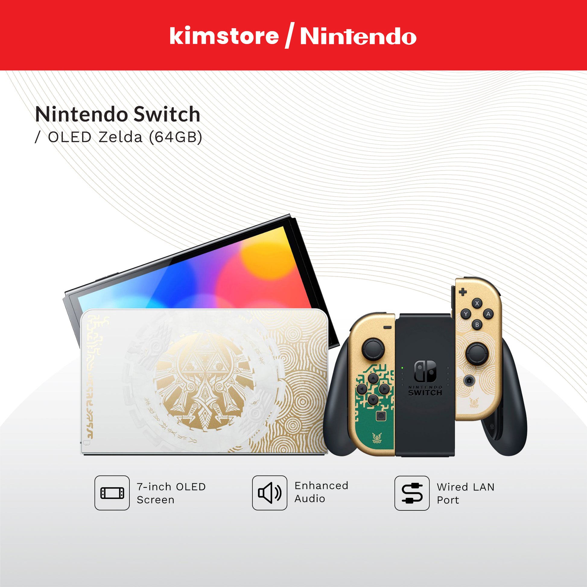 The Nintendo Switch β OLED Model system features a vibrant 7-inch OLED screen, a wide adjustable stand, a dock with a wired LAN port (LAN cable sold separately), 64 GB of internal storage, a portion of which is reserved for use by the system, and enhanced audio in handheld and tabletop mode. The Nintendo Switch β OLED Model system can be played in three modes: TV mode, played on a TV while the system is docked; handheld mode, when the Joy-Con controllers are attached for portable play; and tabletop mode for on-the-go multiplayer gaming sessions. These versatile features are well-suited for the places your epic adventures may take you in-game or in life.